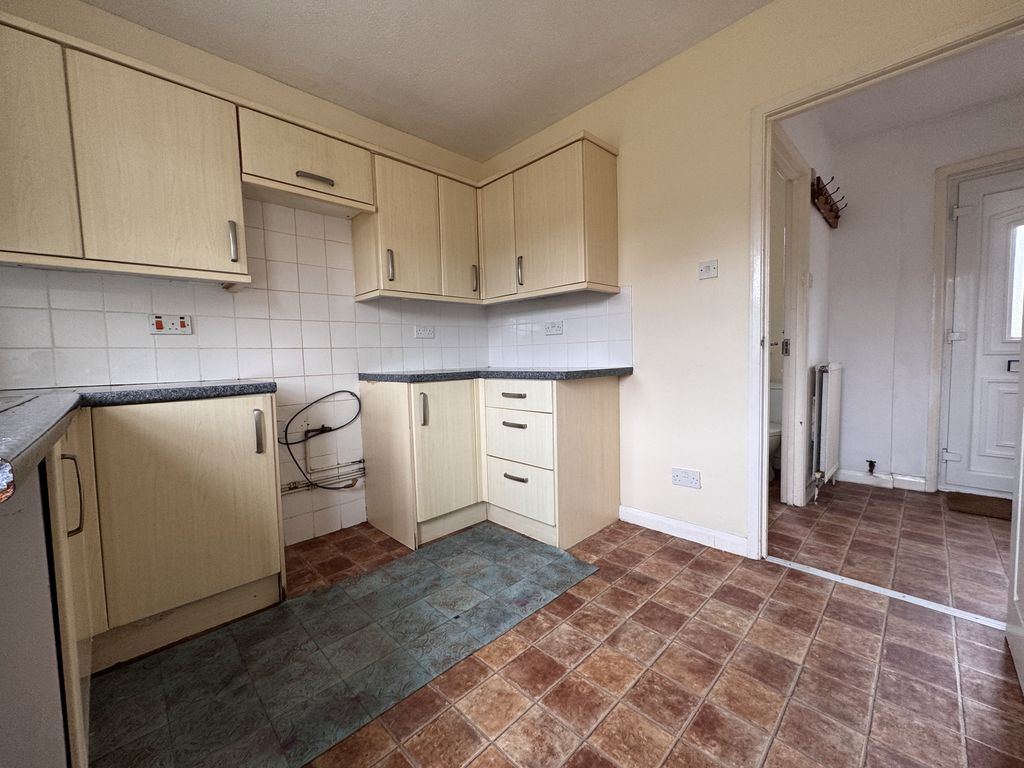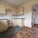 The kitchen completes the ground floor and features a range of base and wall units, along with a useful understairs storage cupboard housing the Worcester boiler. A white uPVC door leads out to the rear garden, which offers a patio area, lawn, shed, and rear access gate—perfect for outdoor enjoyment.